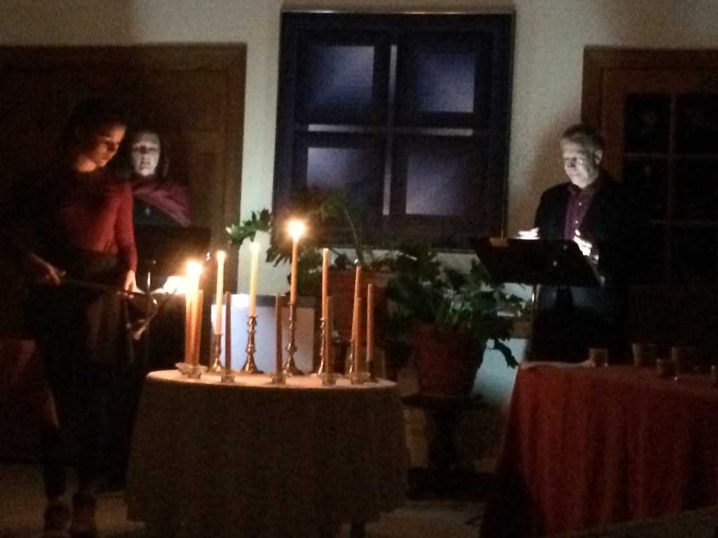 At the end of the meal we will turn out the lights and reenact the last supper by candle light. We will then hear a theatrical, poetical retelling of the story of Jesus’ last eighteen hours of life performed by Meg Albee, Maeve Miller and Tom Kinder. Candles will be extinguished one by one as the disciples desert Jesus, ending in total darkness when he is led to be crucified.